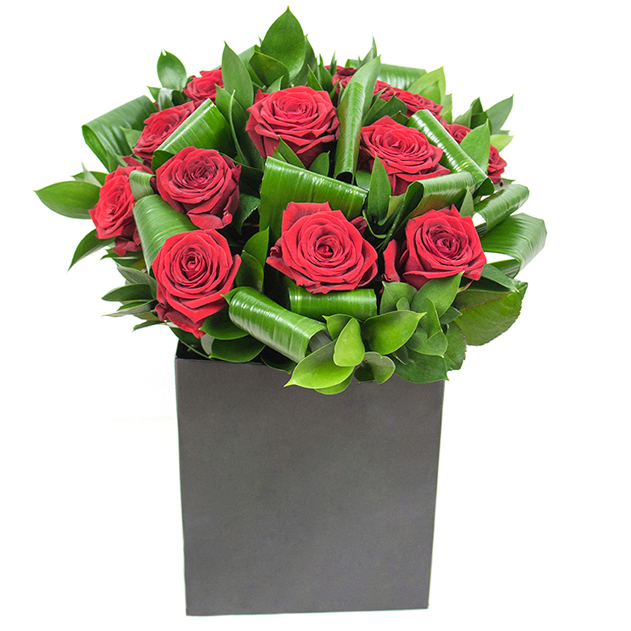 Infuse timeless beauty into your home with our red rose arrangement, gracefully combined with aspidistra leaves and ruscus for a unique and elegant display.