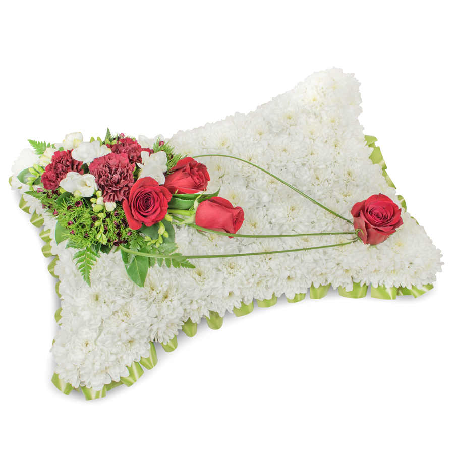 Express your sincere condolences with our refined sympathy bouquet, thoughtfully designed to offer comfort and support. This elegant arrangement features a delicate mix of white chrysanthemums, red roses, white freesias, dark red carnations, complemented by dianthus and bear grass, creating a beautiful and meaningful display.