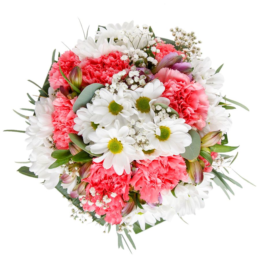 Brighten someone's day with our beautiful bouquet, featuring a stunning mix of snow-white chrysanthemums, delicate gypsophila, and light pink carnations, all gracefully arranged with aspidistra leaves.